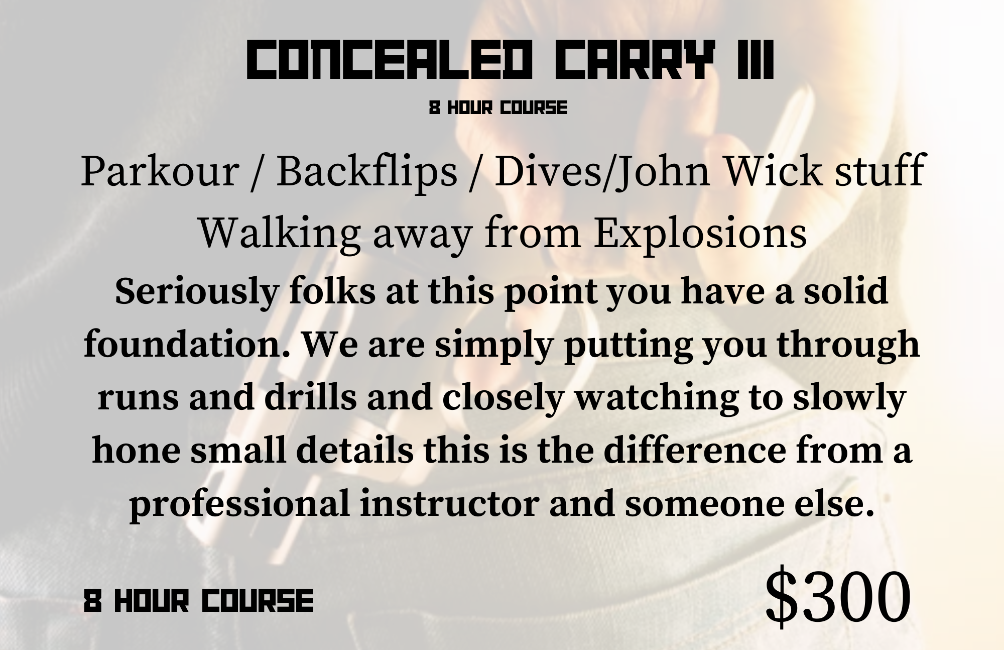 The 3rd phase of concealed carry that is almost 100% focused on situational problems. We work rapid target identification, threat analysis, complex malfunctions, no shoot scenarios, vehicles, and close proximity engagements. This course is designed to put you inside real world time constraints so you are ready to utilize your skills if the encounter ever presents itself.