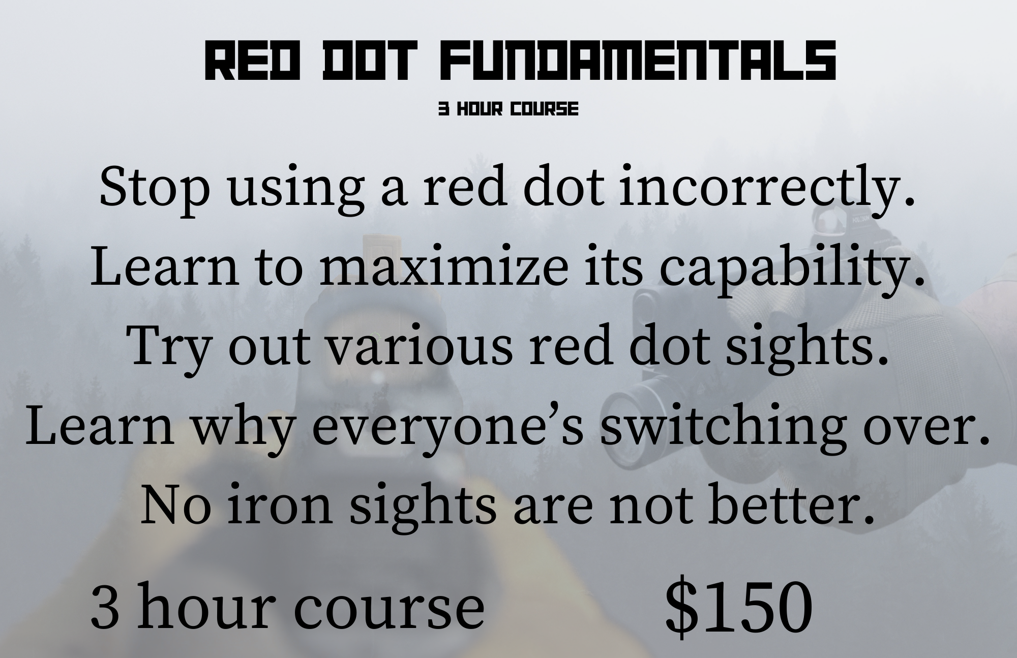 Iron sights are superior, is no longer a phrase spouted among professional soldiers, personal defense experts, and competition shooters. The advances in red dot technology the last decade have made them the king of the hill in terms of speed, precision, and situational awareness for both new and old shooters alike. However with this, comes the void of most people not knowing how to adequately utilize these tools to the best of their ability. This course is designed to not only have you shooting better, but also a mastery of the tool. This course covers from basic attachment, holsters, and zeroing, all the way to rapid target acquisition, transitions, and scenarios. Take your pistol game to the next level.